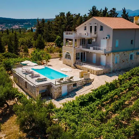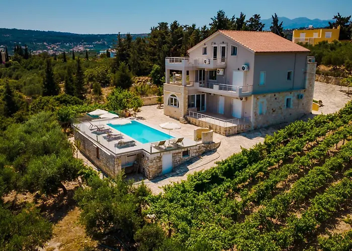 Villa Konstantinos Hilltop Vineyard Escape别墅距离干尼亞市中心有20分钟的步行路程,还配有私人游泳池。 这栋别墅有5间浴室和5间卧室。